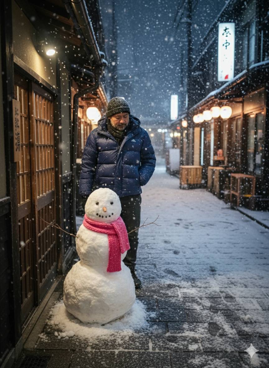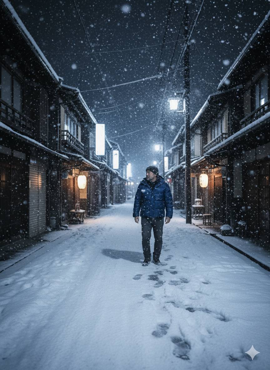 ประตูร้านโอเด้งที่เปิดแง้มอยู่เผยให้เห็นแสงไฟสลัวๆ และควันขาวที่ลอยออกมาจากหม้อโอเด้งอุ่นๆ ปีเตอร์ก้าวขาออกมากลางถนนที่ขาวโพลนด้วยหิมะกองสูง